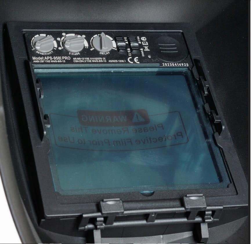 - Zewnętrzna szybka poliwęglanowa 118 × 136 mm (APS-958I/X58E) – chroni filtr spawalniczy przed odpryskami, iskrami oraz zanieczyszczeniami powstającymi podczas spawania i szlifowania. Dzięki wysokiej odporności mechanicznej zabezpiecza wizjer przed uszkodzeniami, co wydłuża żywotność urządzenia.