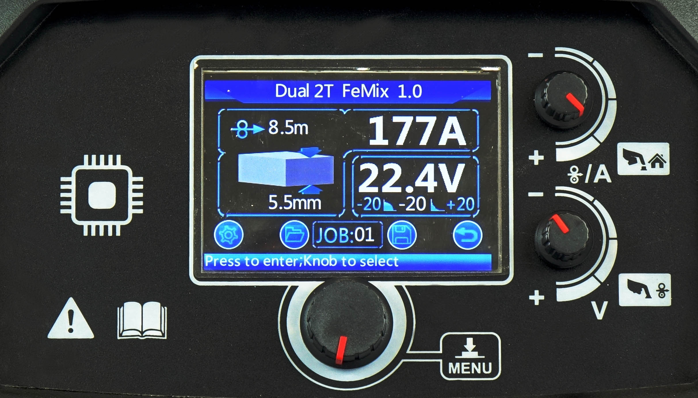 Czytelny i prosty w obsłudze wyświetlacz LCD umożliwia dokładną regulację parametrów spawania MIG takich jak :