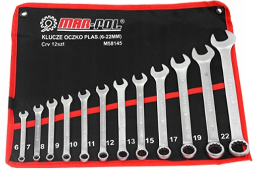 Komplet 12 najbardziej popularnych kluczy płasko-oczkowych wykonanych z wysokogatunkowej stali chromo-wanadowej (CrV) odpornej na korozję.