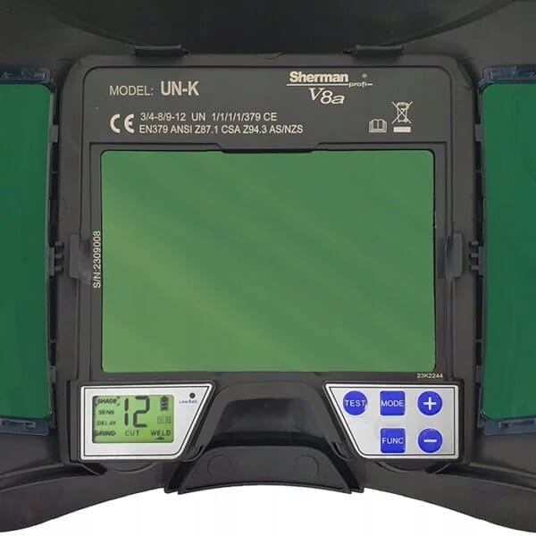 - ✔️ Przyłbica V8a umożliwia regulację stopnia zaciemnienia od 4 do 12 wg DIN, płynną regulację czułości reakcji fotoczujników na intensywność łuku podczas spawania, a także regulację czasu opóźnienia przełączania stanu ciemny/jasny i zmianę trybu pracy na szlifowanie.