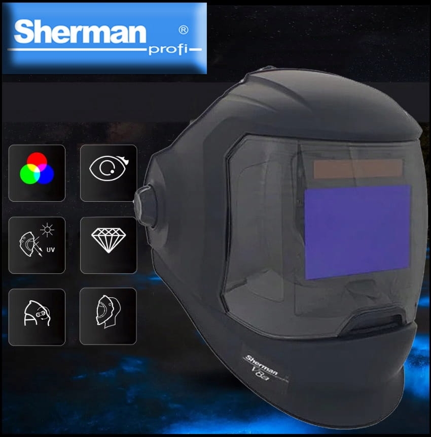 Automatyczna przyłbica spawalnicza Sherman-profi V8a przeznaczona jest do ochrony oczu i twarzy przed iskrami, odpryskami i szkodliwym promieniowaniem podczas spawania elektrycznego i gazowego, lutospawania, lutowania, cięcia tlenem oraz szlifowania. System ochrony dróg oddechowych PAPR poprzez wymuszony nawiew wytwarza nadciśnienie wewnątrz przyłbicy zapobiegając wdychaniu przez spawacza pyłów i oparów spawalniczych.