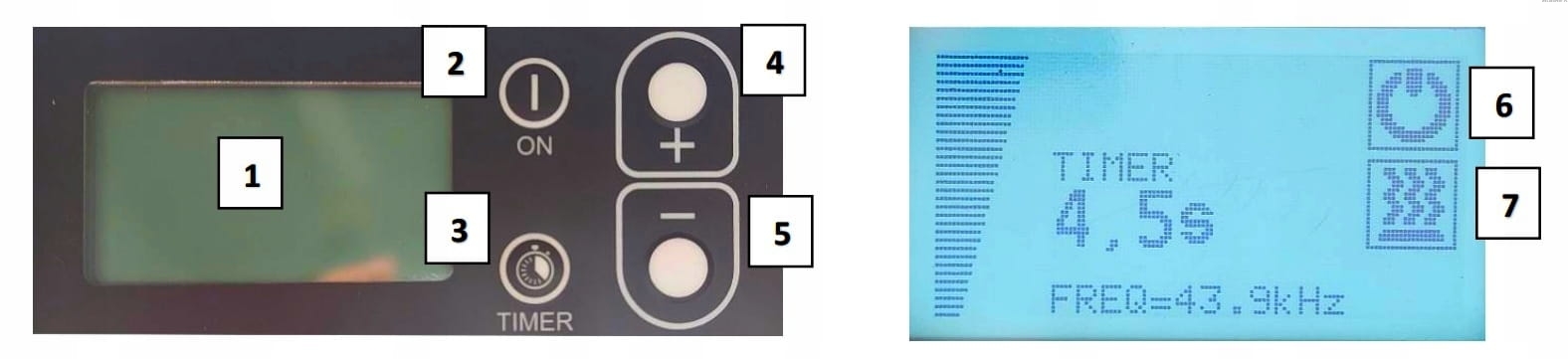 - Wyświetlacz LCD – Wyświetla parametry pracy: czas, moc, częstotliwość.