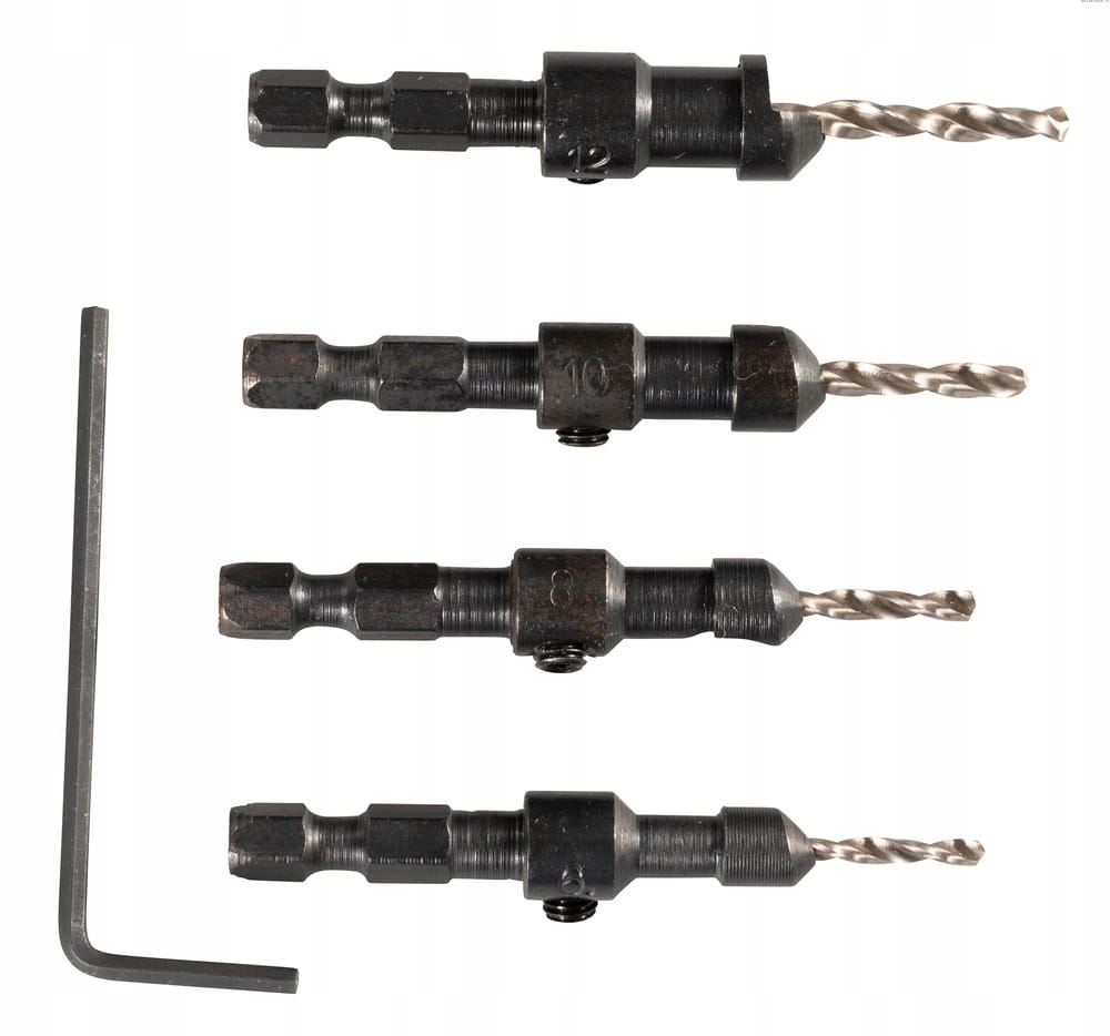 Zestaw pogłębiacz stożkowy i wiertła 4 szt. D-734552 to komplet składający się z czterech wymiennych pogłębiaczy przeznaczonych do wkrętaków Quad. Każdy z pogłębiaczy ma inną średnicę, co pozwala na ich użycie z różnymi rozmiarami śrub.
