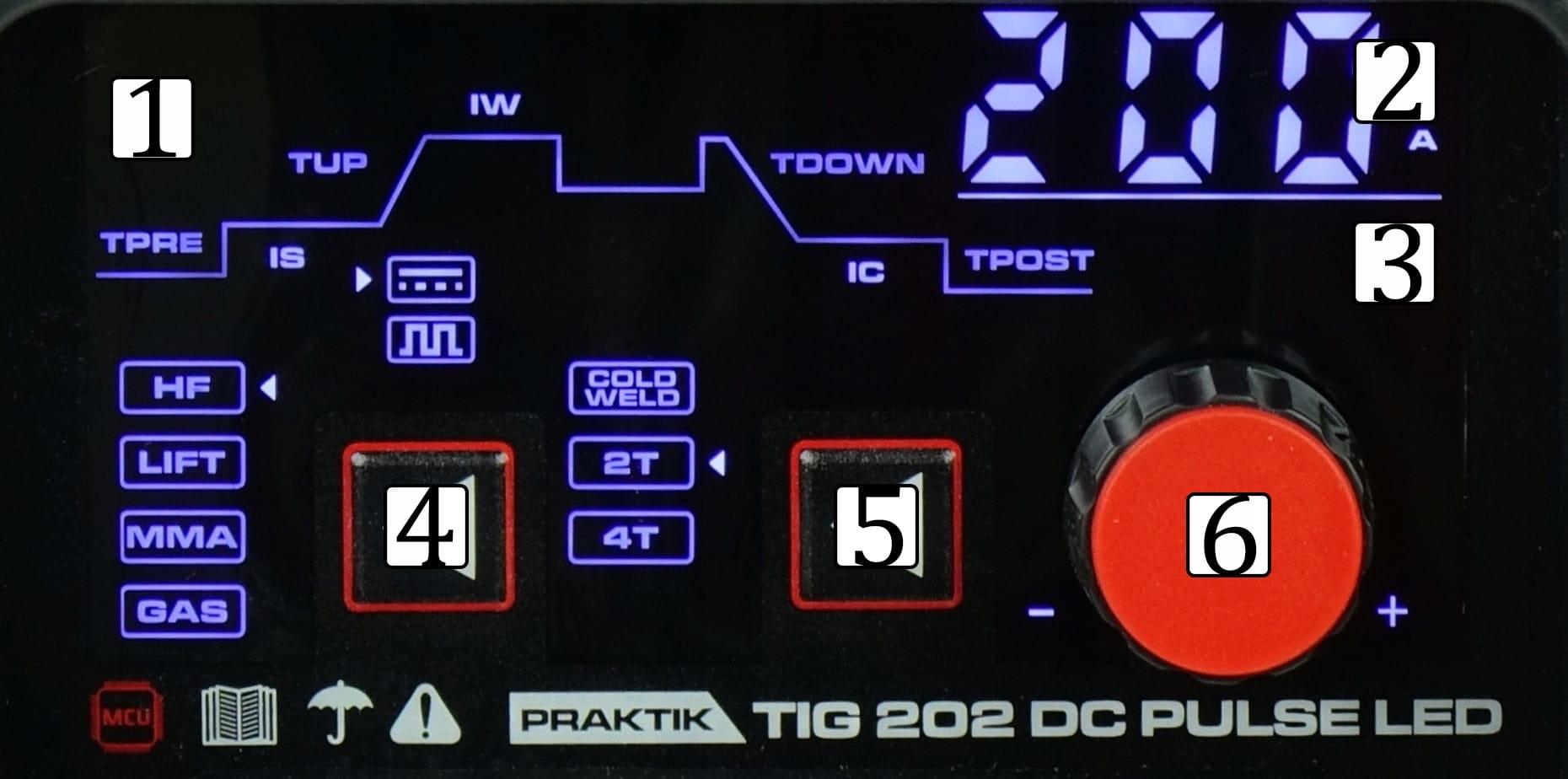 IDEAL PRAKTIK TIG 202 DC PULSE DIGITAL posiada czytelny i łatwy w obsłudze panel funkcyjny, który posiada m.in.: