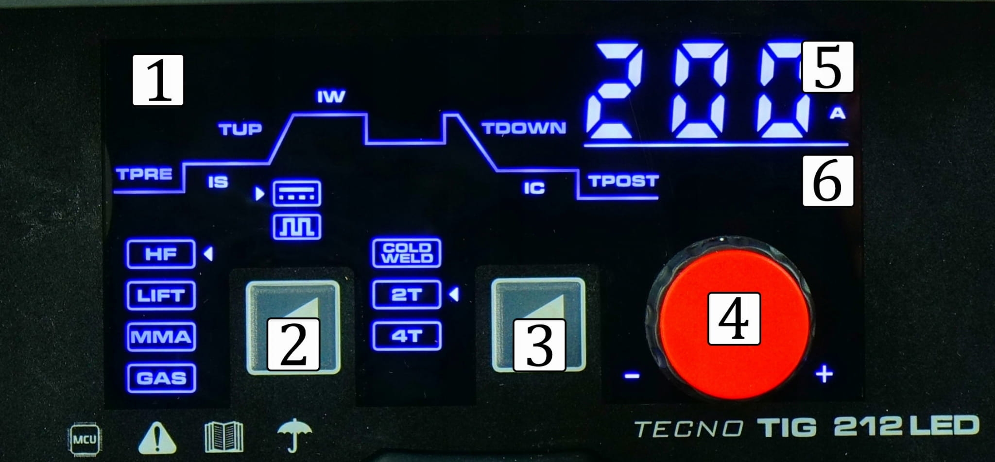IDEAL TECNO TIG 212 DC PULSE LED posiada czytelny i łatwy w obsłudze panel funkcyjny, który posiada m.in.: