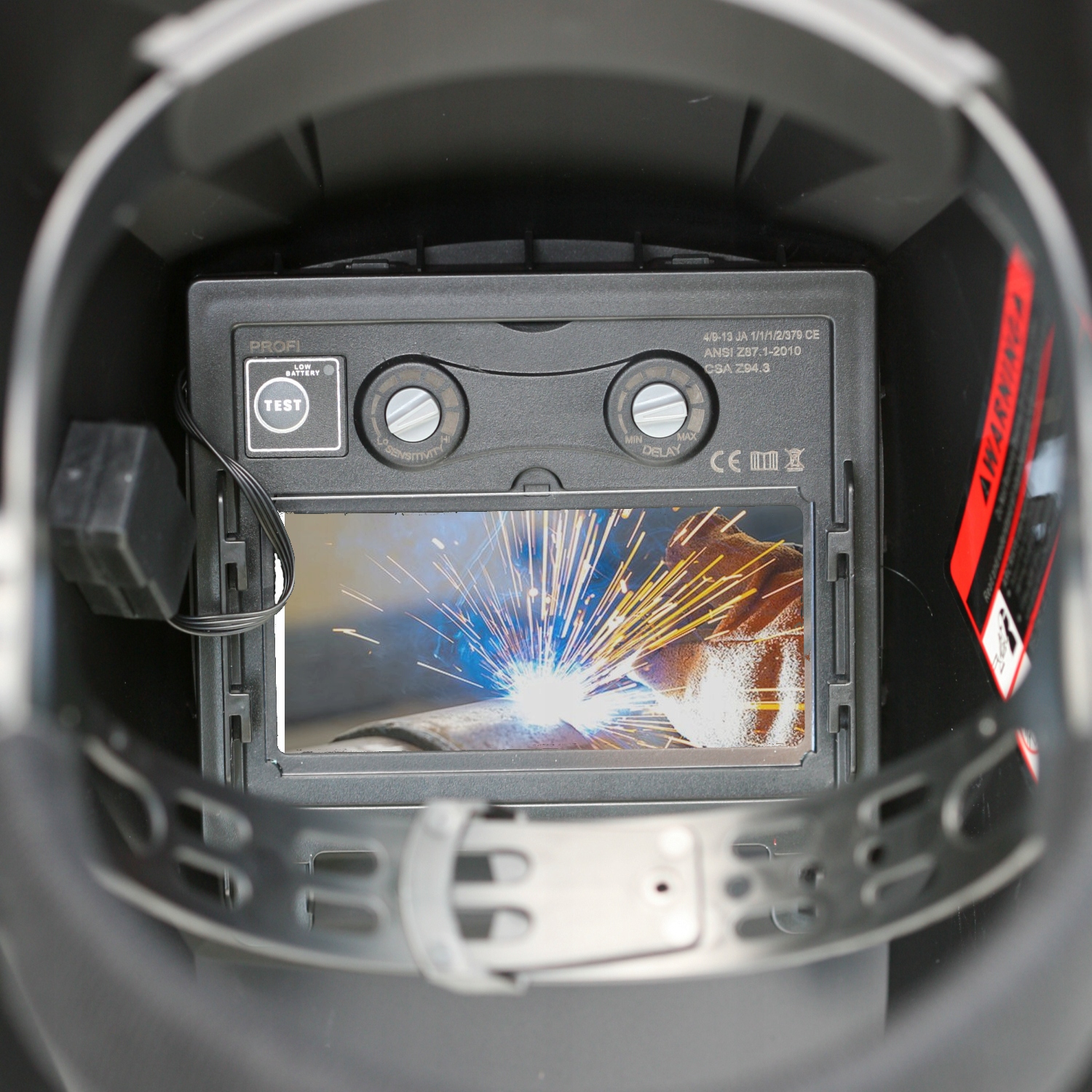 Przyłbica automatyczna jest wykonana z polimeru, jest zasilana przez baterie i ogniwa solarne. Włączanie i wyłączanie odbywa się