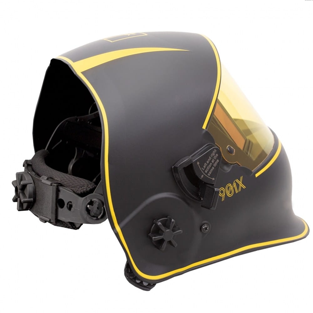 Przyłbica Pro 901X posiada automatyczny filtr spawalniczy o najwyższej klasie optycznej – 1/1/1/1, Idealną widoczność zapewnia duże pole widzenia – 100x65mm. Przyłbica 901X dodatkowo wyposażona jest w specjalny mechanizm podnoszenia i opuszczania filtra spawalniczego. Podczas jego podniesienia środek ciężkości przyłbicy jest niższy i zbiega się ze środkiem ciężkości głowy. Zmniejsza to zmęczenie szyi spawacza znacząco podnosząc jego komfort pracy. Zwiększa się również pole widzenia – 165x72mm, a oczy spawacza zabezpieczone są szybką ochronną.