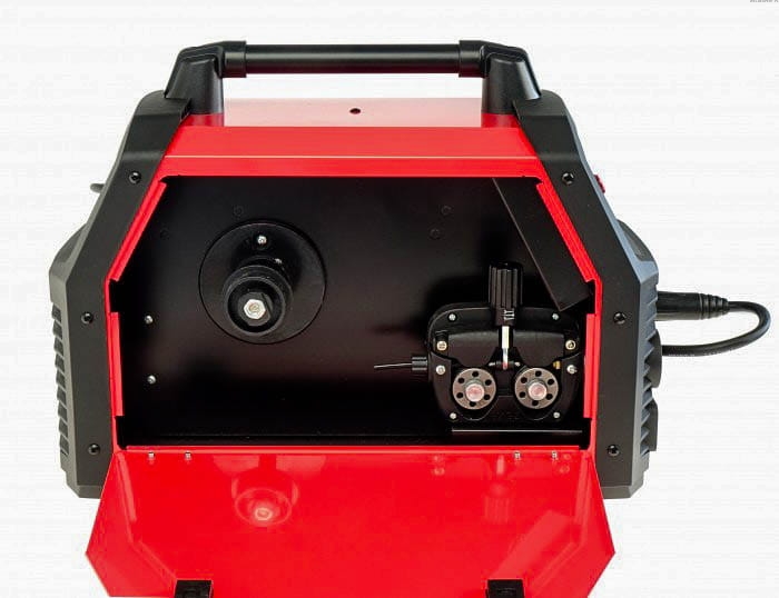 4- rolkowy podajnik umożliwia precyzyjny wysuw drutu spawalniczego wykluczając jego poślizg.