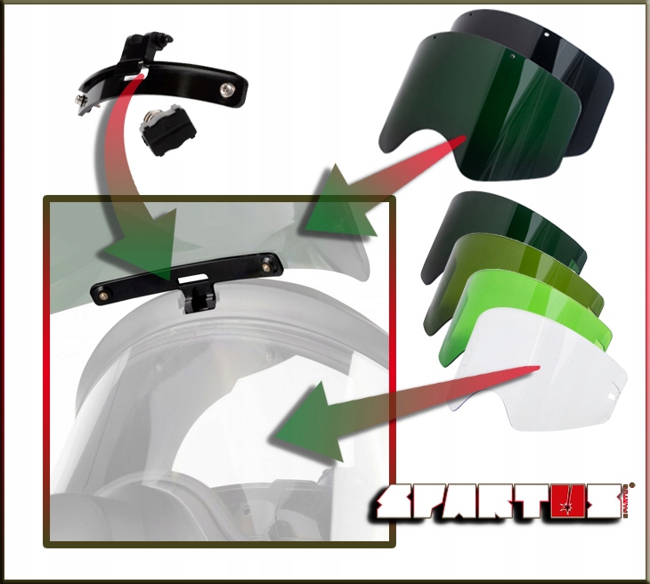 Jednym z głównych atutów przyłbicy SPARTUS BEAR jest jej modułowa konstrukcja, umożliwiająca łatwą wymianę osłon w zależności od potrzeb użytkownika. Dostępne są różne typy osłon: