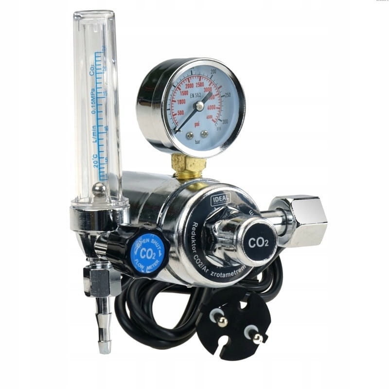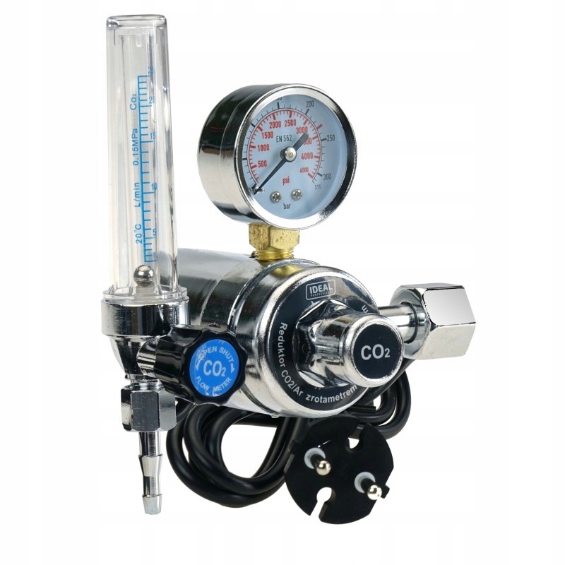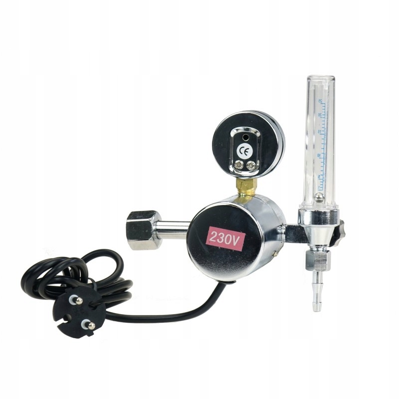 Reduktor CO2 / Ar z rotametrem i podgrzewaczem przeznaczony jest do obniżenia ciśnienia wylotowego gazu technicznego do wymaganego ciśnienia roboczego. Zawór redukcyjny utrzymuje stałą wartość ciśnienia wylotowego niezależnie od wartości ciśnienia wlotowego. Zasilanie reduktora 230V.