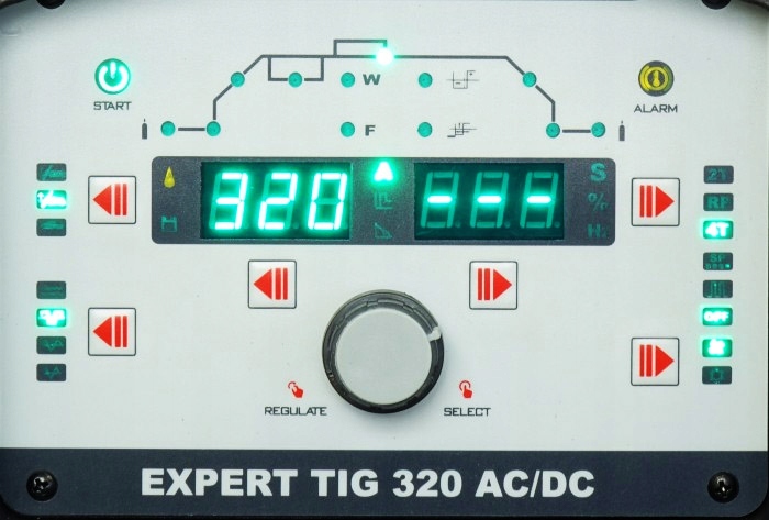 Spawarka EXPERT TIG 320 AC/DC posiada czytelny i łatwy w obsłudze panel funkcyjny, który posiada m.in.: