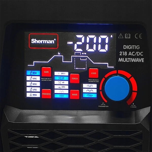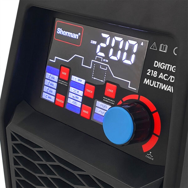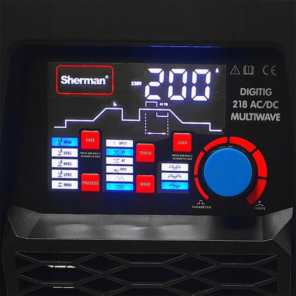 Spawarka SHERMAN DIGITIG 218 AC/DC MULTIWAVE posiada czytelny i łatwy w obsłudze panel funkcyjny, który posiada m.in.: