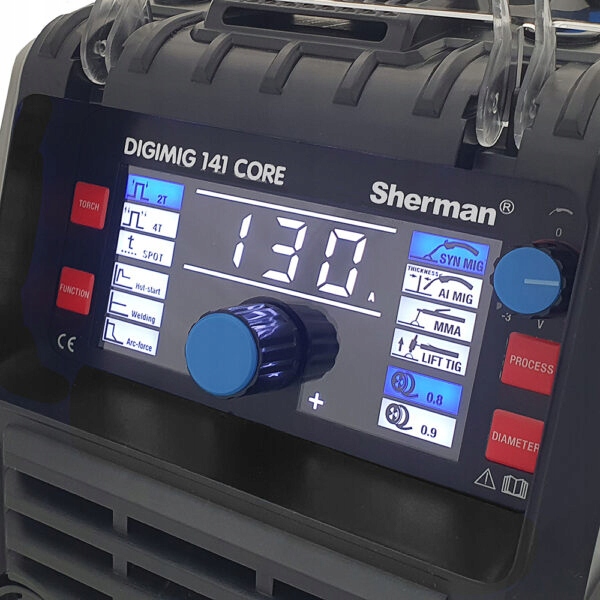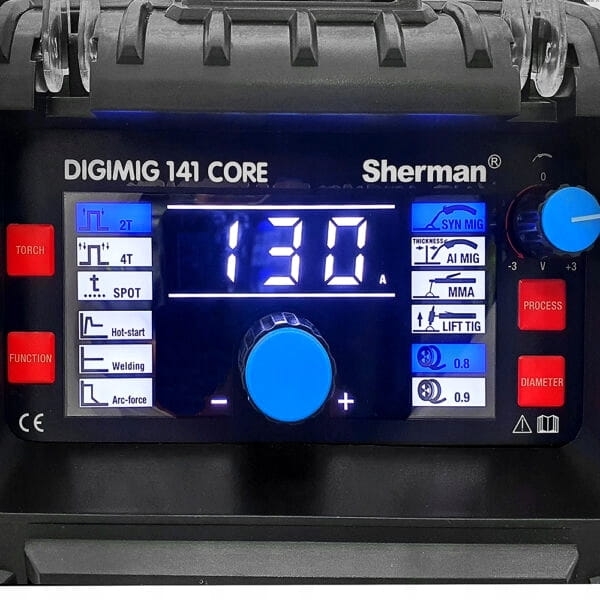 Spawarka SHERMAN DIGIMIG 141 CORE posiada czytelny i łatwy w obsłudze panel funkcyjny, który posiada m.in.: