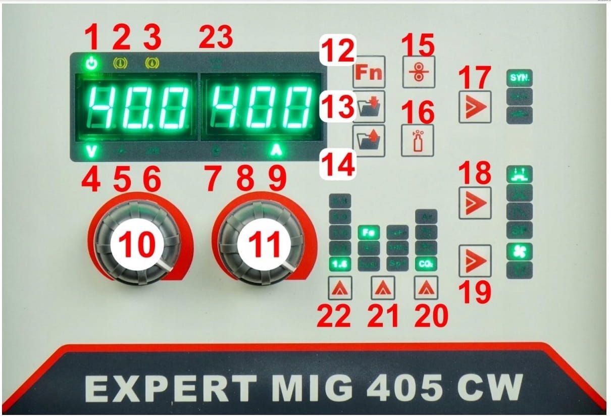 IDEAL EXPERT MIG 405 COMPACT SYNERGIC posiada czytelny i łatwy w obsłudze panel funkcyjny, na którym znajduję się m.in.: