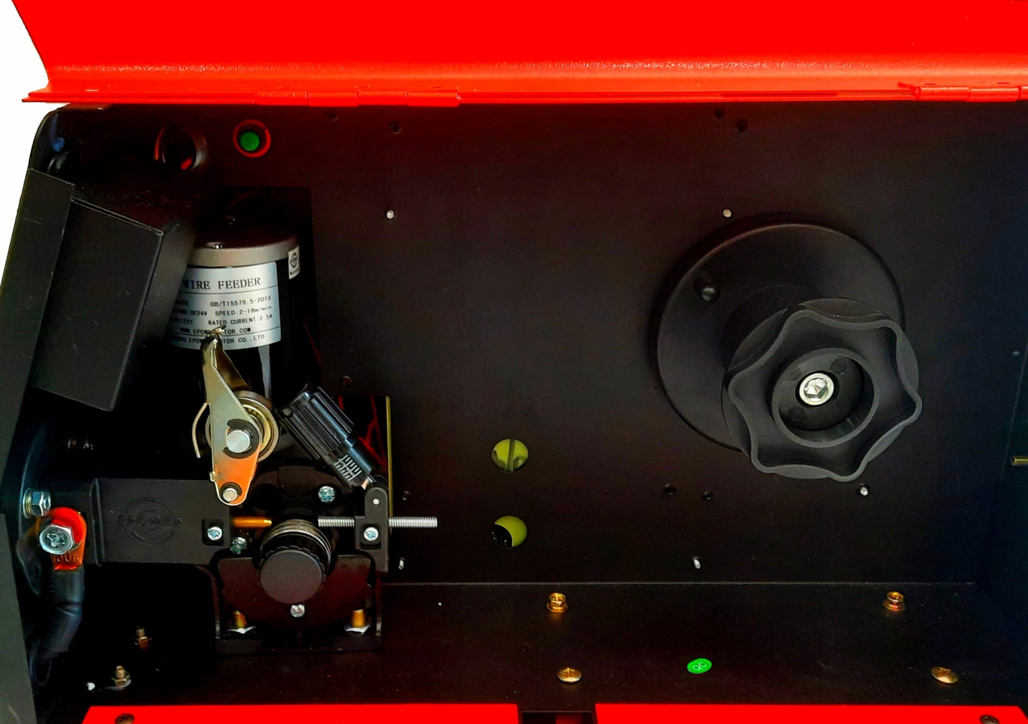 Podajnik posiada pokrętło szybkiej wymiany drutu jak i rolki podającej drut.