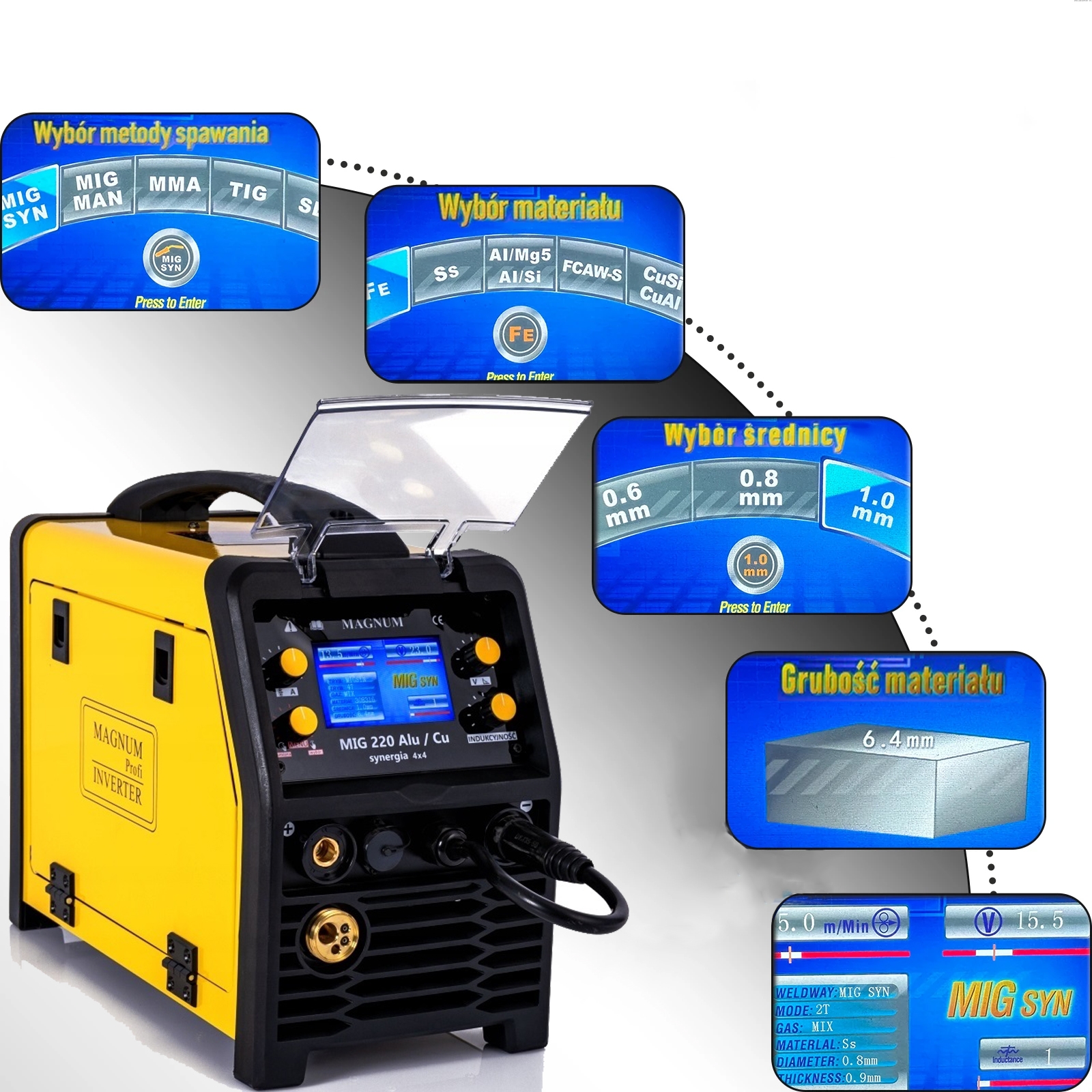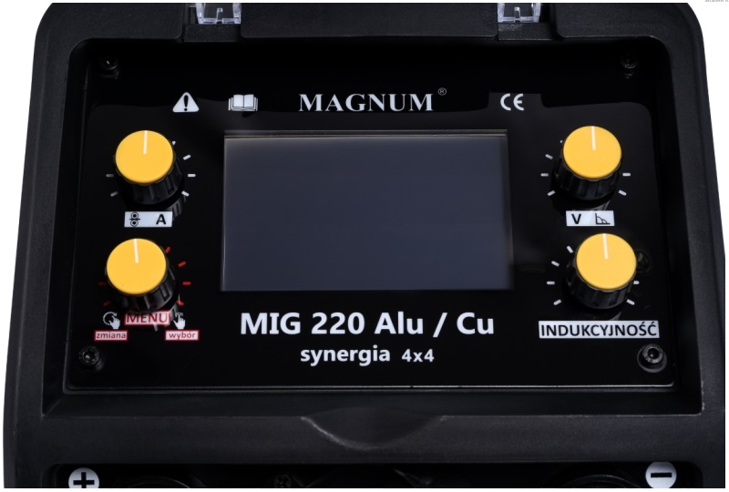 MAGNUM MIG 220 ALU/CU SYNERGIA 4X4 posiada czytelny i łatwy w obsłudze panel funkcyjny, który posiada m.in.: