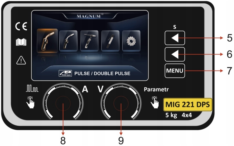 MAGNUM MIG 221 DPS 4X4 posiada czytelny i łatwy w obsłudze panel funkcyjny, który posiada m.in.: