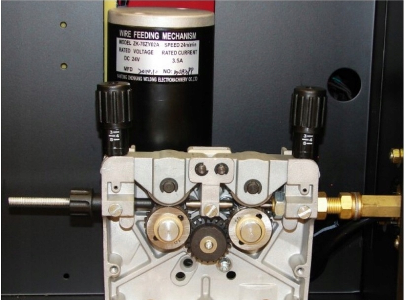 Podajnik posiada pokrętło szybkiej wymiany drutu jak i rolki podającej drut.