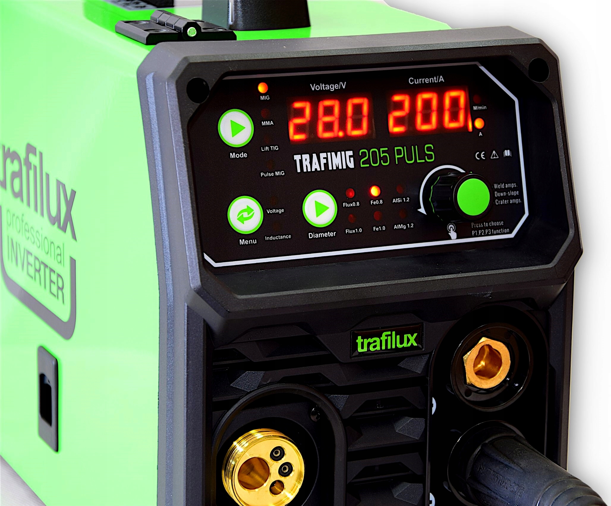 TRAFILUX TRAFIMIG 205 PULS posiada czytelny i łatwy w obsłudze panel funkcyjny, który posiada m.in.: