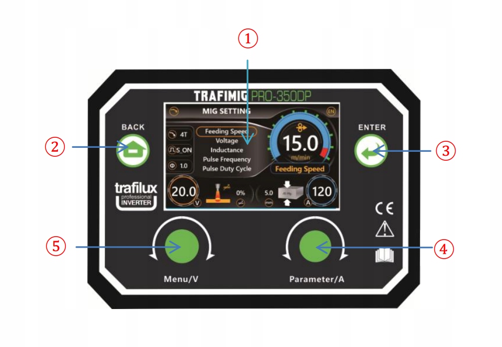 - 5. Lewe pokrętło: wyboru trybu spawania / regulacja napięcia / potwierdzenie wyboru,