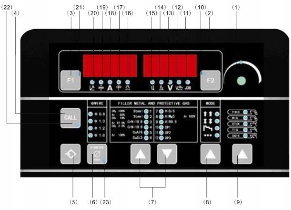 - Przyciski wyboru spawanego materiału i rodzaju gazu ochronnego,