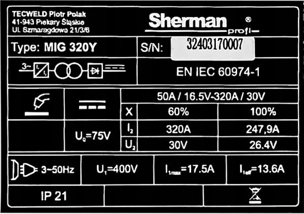 - Spawarka SHERMAN MIG 320Y/4R - 1 szt.