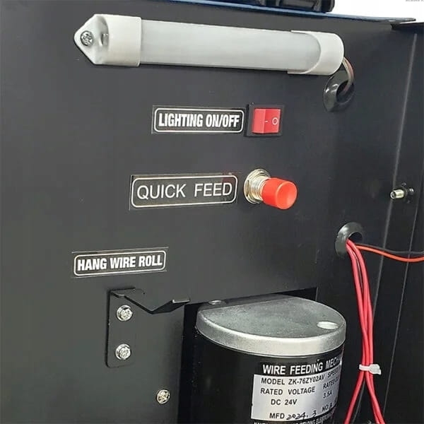 Urządzenie posiada również oświetloną komorę podajnika oraz wieszak na rolki, które znacząco ułatwiają wymianę szpuli z drutem i rolek prowadzących oraz utrzymanie porządku.