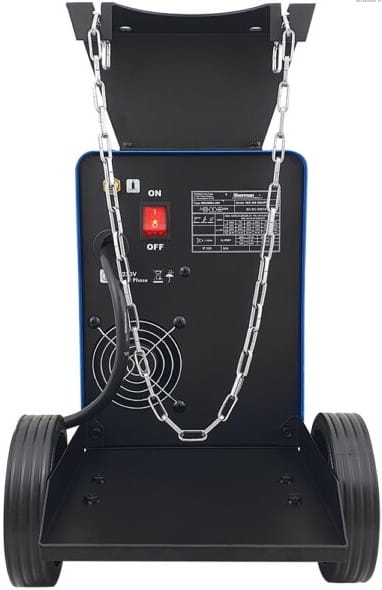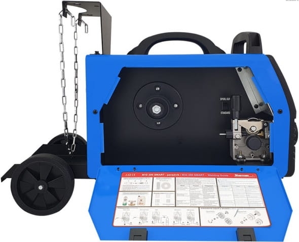 ✔️ MOBILNOŚĆ I WYGODA - PODWOZIE Z MIEJSCEM NA BUTLĘ - spawarka posiada dokręcane podwozie jezdne. Z tyłu urządzenia znajduje się miejsce na butlę z gazem osłonowym.