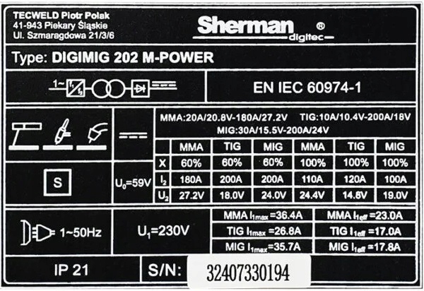 SPAWARKA INWERTOROWA SYNERGICZNA SHERMAN DIGIMIG 202 M-POWER SYNERGIA 230V