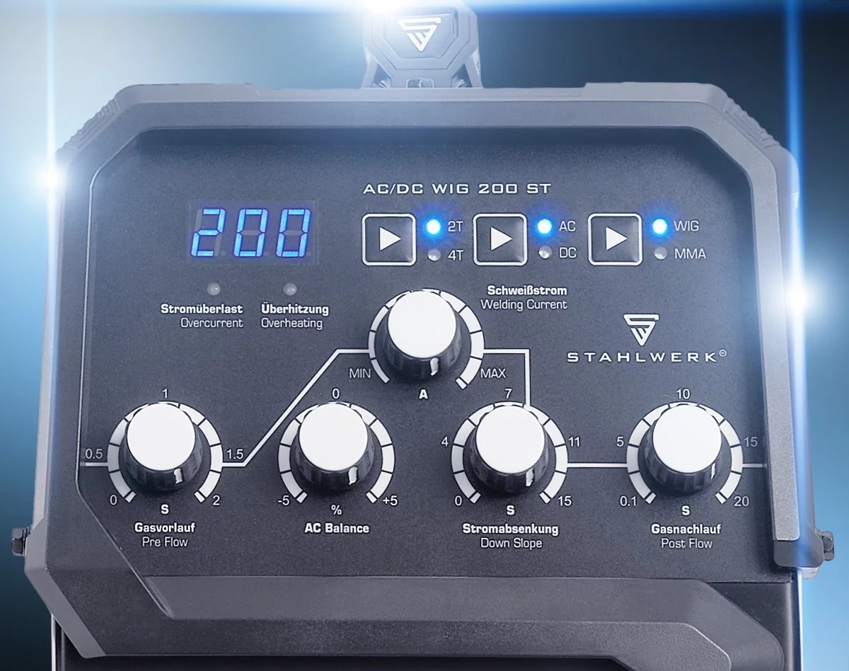 Spawarka STAHLWERK AC/DC TIG 200 ST posiada czytelny i łatwy w obsłudze panel funkcyjny, który posiada m.in.: