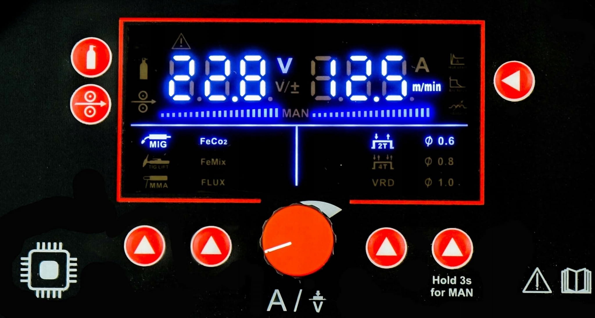 Z poziomu wyświetlacza za pomocą miękkich przycisków możemy przełączać progamy spawania, dobierać prędkość posuwu drutu, włączać niezbędne funkcje a także regulować napięcie prądu.
