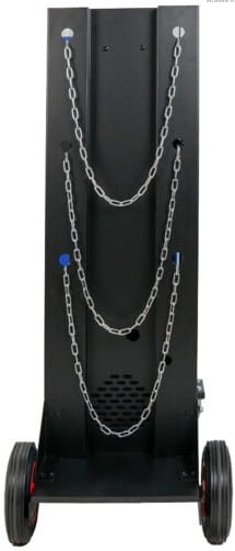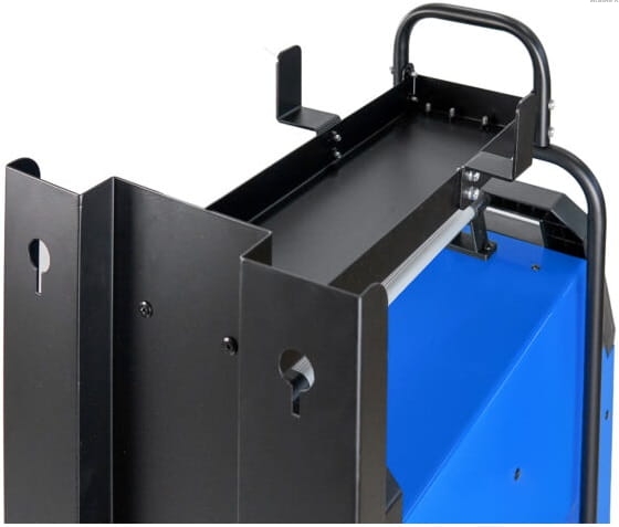 ✔️ Spawarka zabudowana jest na stabilnym wózku, z bardzo praktyczną półką na akcesoria i uchwytami na drut spawalniczy oraz wieszakami na uchwyt i przewody spawalnicze.