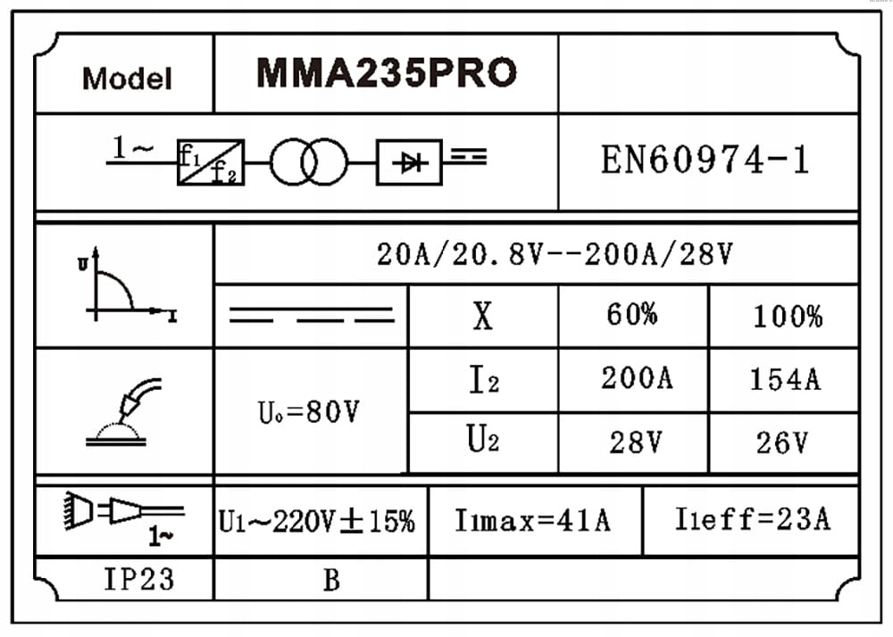 Urządzenie posiada wysoki maksymalny prąd spawania 200A, przy cyklu pracy 60%.
