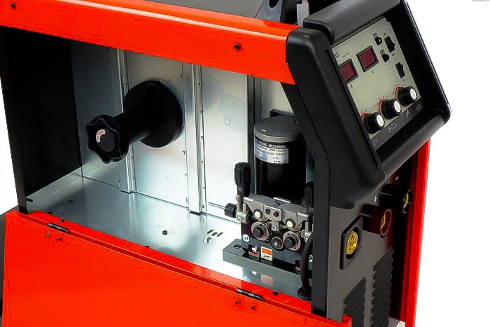 Spawarka została wyposażona w profesjonalny podajnik drutu, który gwarantuje stabilność i ciągłość pracy urządzenia. 4-rolkowy podajnik umożliwia precyzyjny wysuw drutu spawalniczego wykluczając jego poślizg. Poprzez zastosowanie 4-rolkowego podajnika urządzenie zapewnia stabilne podawanie drutu tak ważne przy spawaniu aluminium oraz bardzo dobrze radzi sobie z 5 metrowymi uchwytami spawalniczymi.