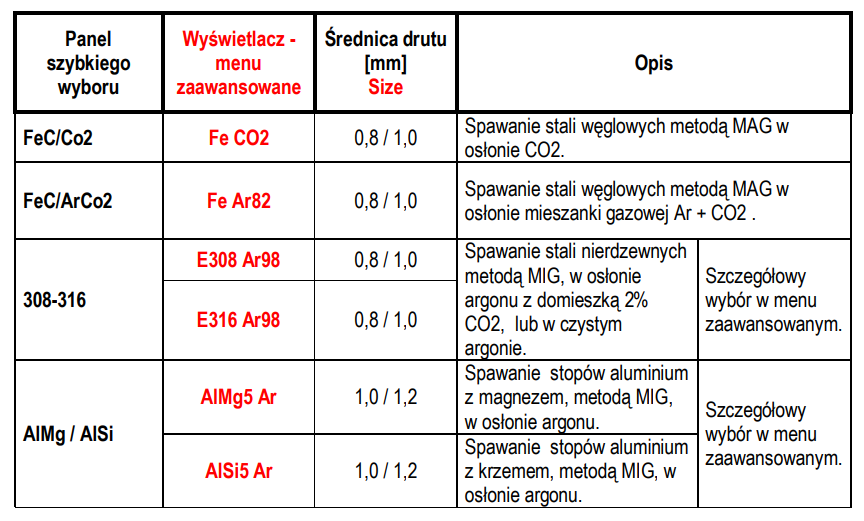 - WYBÓR MATERIAŁU + OSŁONA GAZOWA - Możliwość wybrania: FeC/CO2 / FeC/82%Ar+CO2 / ss-308/98%Ar+CO2 / ss-316/98%Ar+CO2 / AlMg5/Ar / AlSi5/Ar