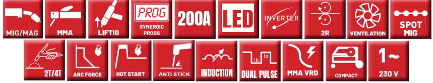 - PRĄD SPAWANIA - Regulacja w zakresie~28 ÷ 200 A (z pojedynczym pulsem~16 ÷ 200 A). Zakres prądu spawania zależy od wybranej średnicy drutu i materiału.