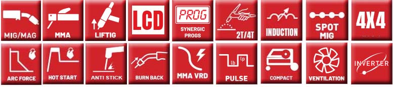 - Napięcie spawania MIG/MAG: 16,5 - 24 V