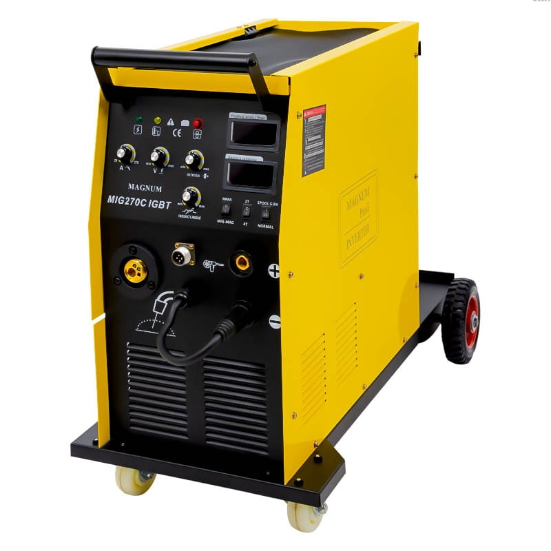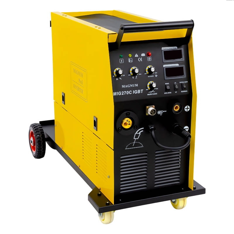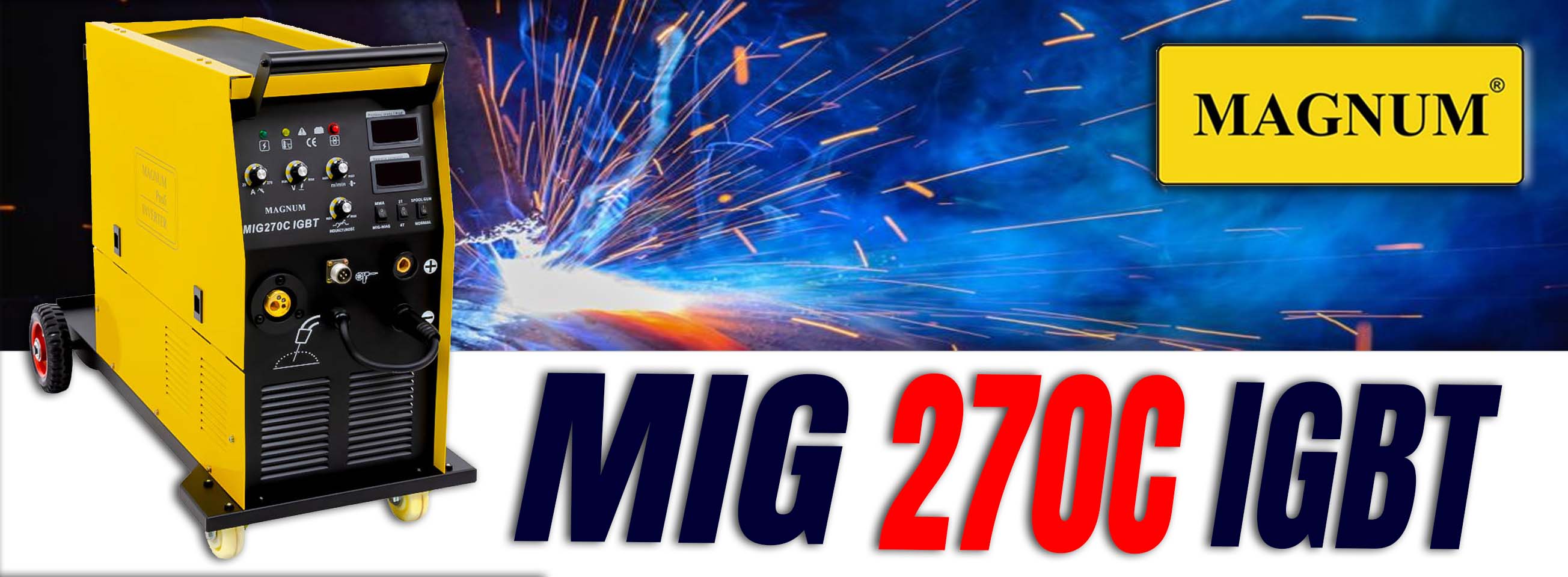 Spawarka MAGNUM MIG 270C IGBT to profesjonalny półautomat spawalniczy zasilany z sieci trójfazowej 400V o maksymalnym prądzie spawania 270A.