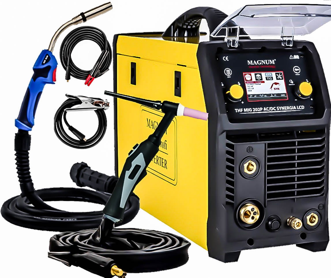THF MIG 202 LCD AC/DC SYNERGIA LCD marki MAGNUM to zawansowane technologicznie urządzenie spawalnicze przeznaczone do ręcznego, elektrycznego spawania wszelkich spawalnych metali i stopów np.: