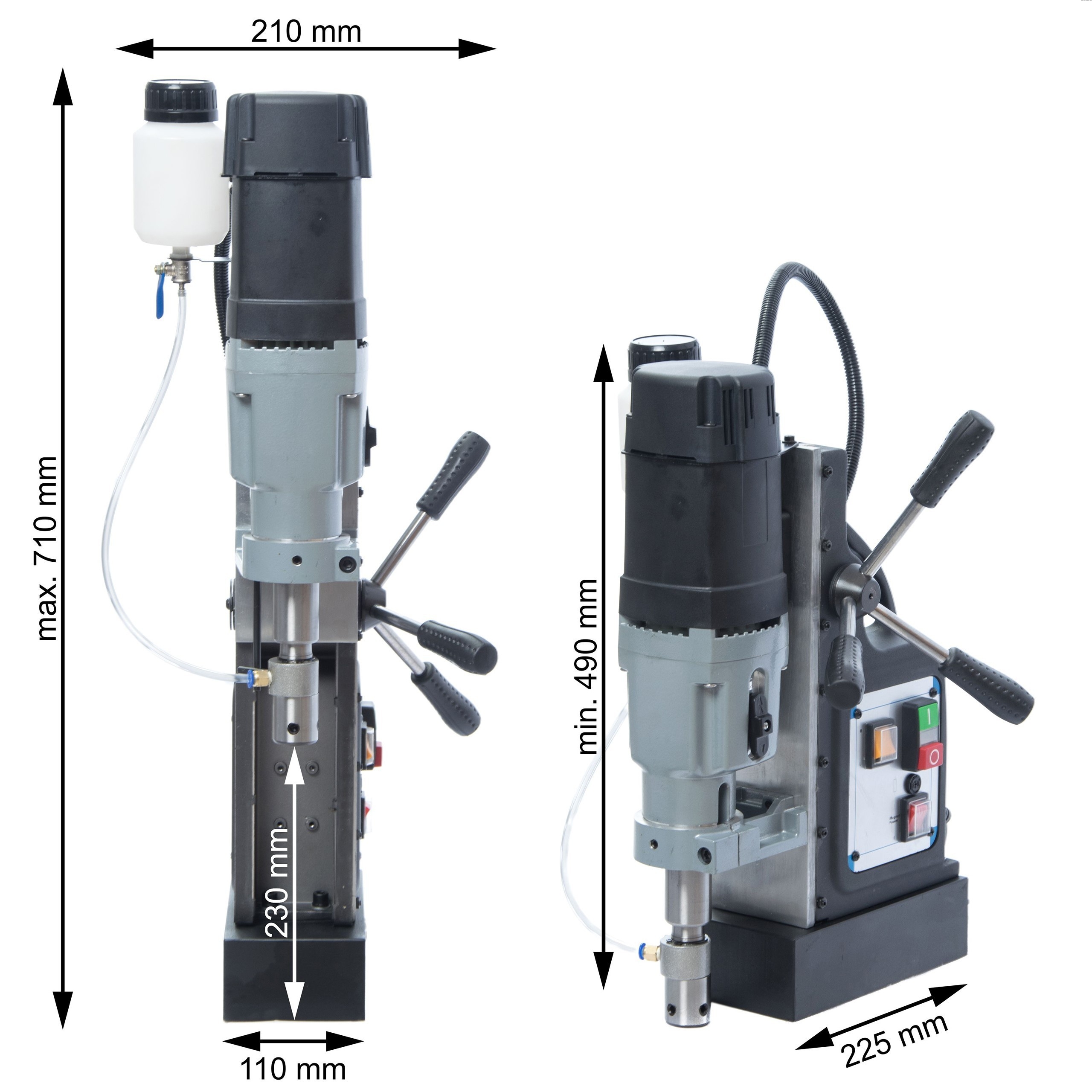 Dzięki silnemu elektromagnesowi 18 000 N oraz uchwytowi stożek Morse’a MT3, urządzenie zapewnia pewne przyleganie do powierzchni, minimalne drgania i bezpieczną obsługę. 2 biegi, obroty prawo/lewo oraz skok wrzeciona 210 mm umożliwiają dokładne wiercenie i gwintowanie w różnych materiałach, zarówno przy małych, jak i większych średnicach otworów.