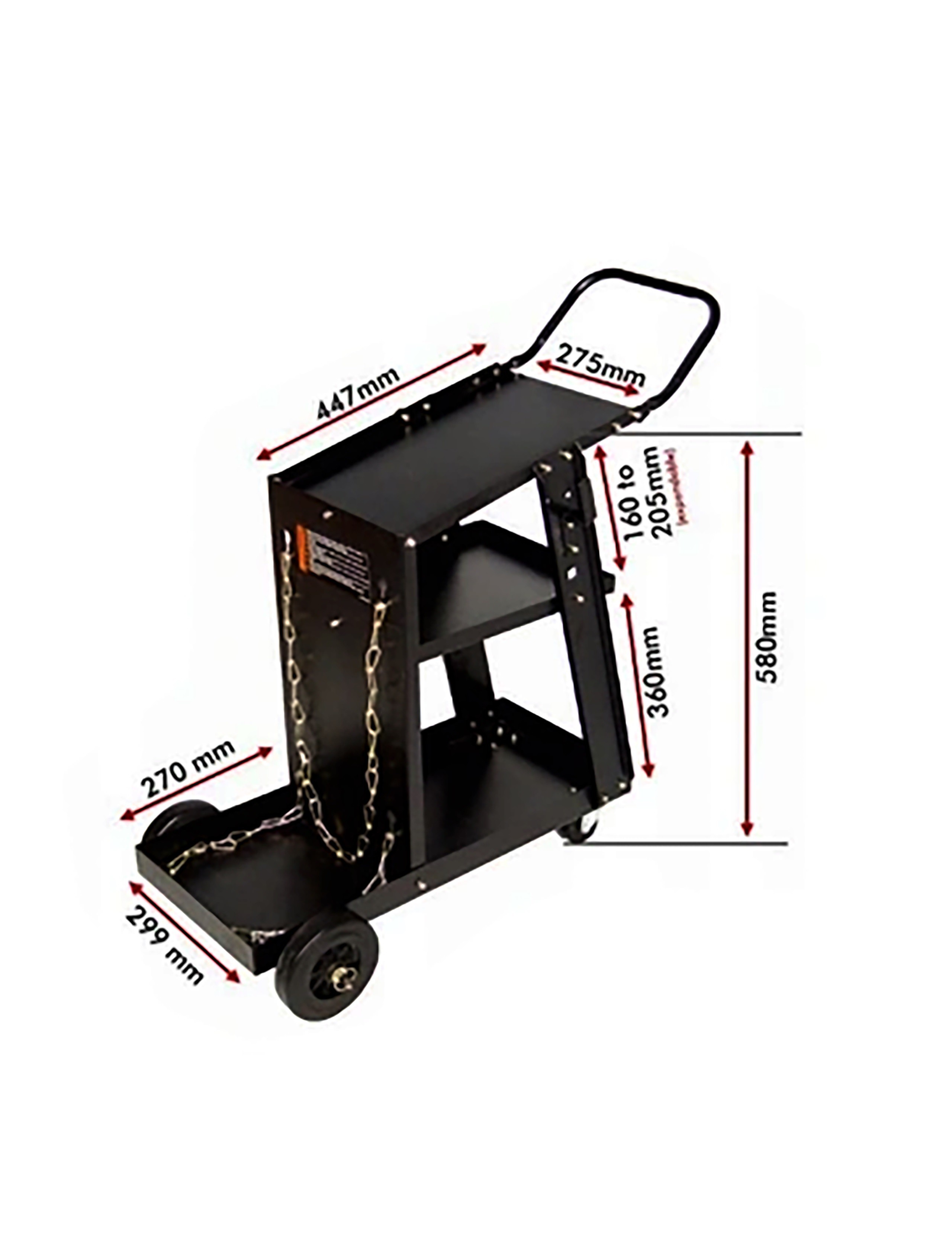 ➡️ Konstrukcja wózka została wykonana z grubej, wysokiej jakości stali, co zapewnia dużą wytrzymałość oraz stabilność podczas pracy. Maksymalne obciążenie wynosi aż 90 kg, dzięki czemu bez problemu pomieści spawarkę, butlę z gazem oraz dodatkowe wyposażenie.