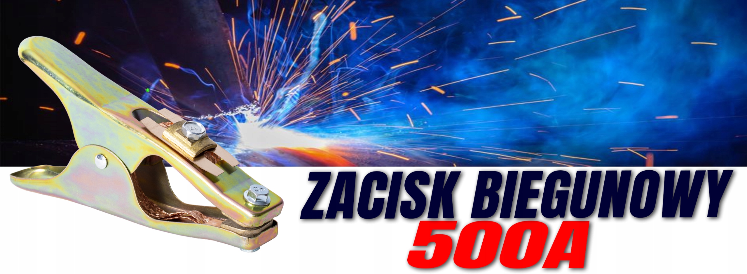 Zacisk kleszczowy, biegunowy o maksymalnej obciążalności prądowej do 500A, stosowany w spawalniczych przewodach masowych.